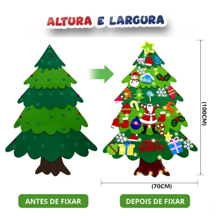 Feita em feltro macio e seguro, ela vem com 32 enfeites destacáveis + pisca pisca LED para brincar com diversão e criatividade.